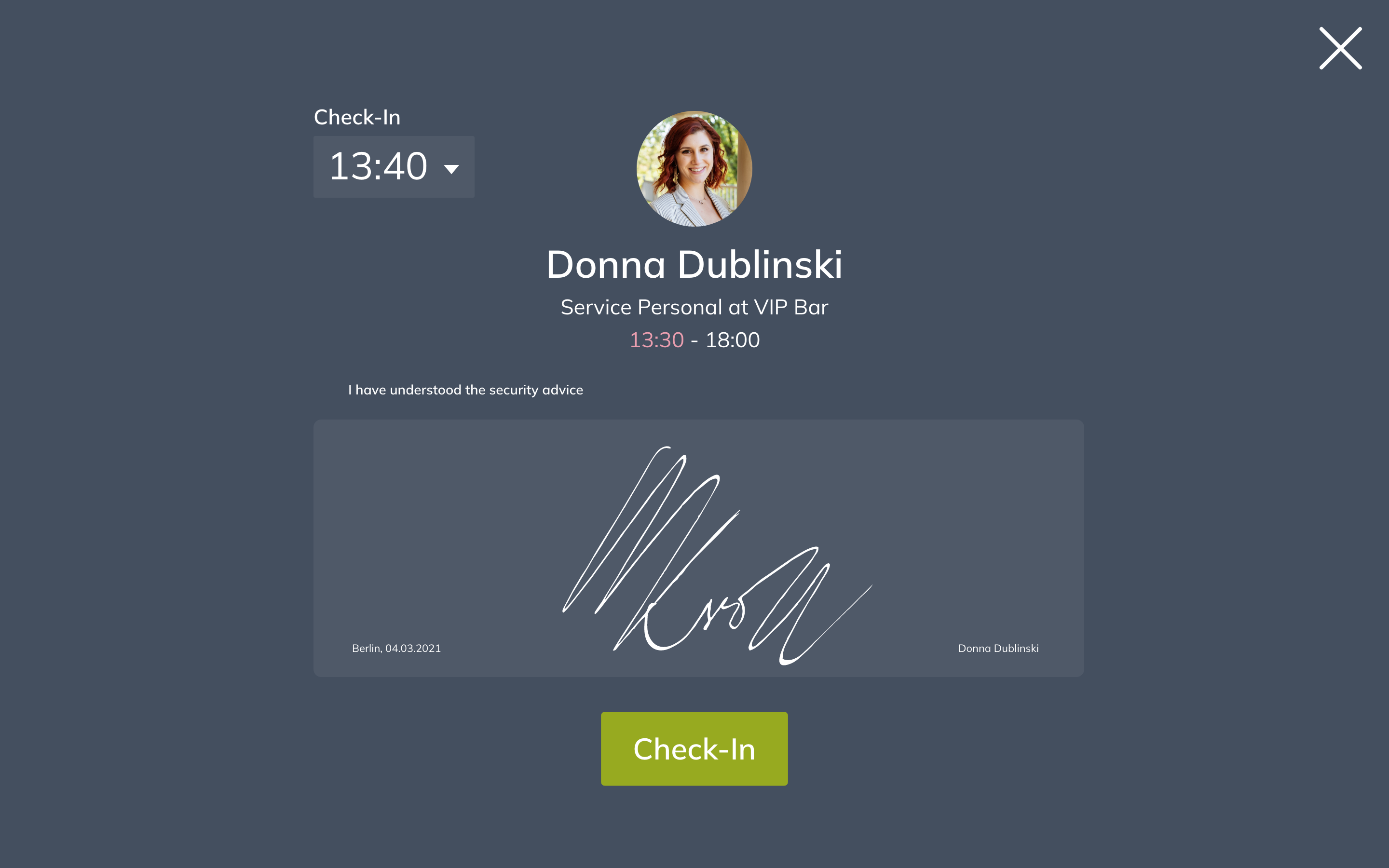 Der QR-Code des Kontaktes kann nun gescannt werden. Automatisch wird der entsprechende Job sowie Kontakt gefunden und das CheckInformular geöffnet. Hier kann nun die Startzeit angepasst werden sowie kann bei Bedarf eine Unterschrift abgefragt werden. Dies ist durch die Auftragseinstelkung CheckIn erfordert Unterschrift möglich.