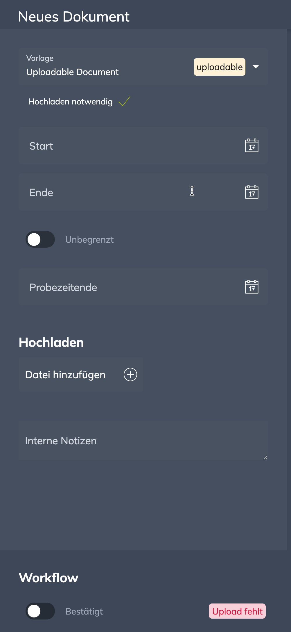 Im Bewerber- bzw. Kontaktprofil kann im Tab Dokumente über den Neu-Button ein neues Dokument erstellt werden. Hierbei können individuelle Felder w.z.B. Start und Ende definiert werden. Dies kann jedoch auch im Anschluss erfolgen.