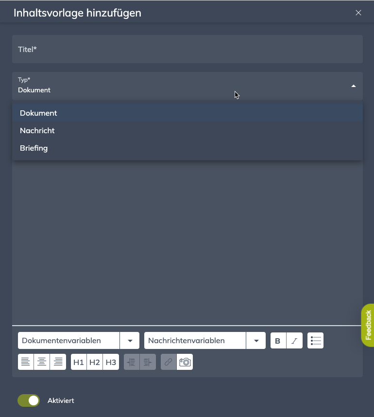 Mit der Hilfe von Inhaltsvorlagen können deine Projektleiter mit nur einem Klick Textbausteine in Dokumente, Nachrichten oder Briefings hinzufügen. Du gelangst zu Inhaltsvorlagen, indem du auf Systemeinstellung > Inhaltsvorlagen klickst.
