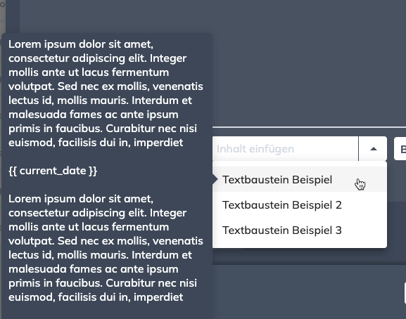 In den jeweiligen Erstellungsformularen können die Inhalte der Inhaltsvorlage mit einem Klick über den Button Inhalt einfügen in den gewünschten Bereich eingefügt werden.