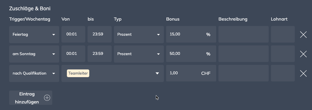 Neben der normalen Lohnkalkulation können auch automatisch Zuschläge w.z.B. Sonntags- oder Feiertagszuschlag je Lohnprofil definieren. Ist ein Zuschlag für den ganzen Tag gewünscht, ist die Zeitperiode von 00:01 - 23:59 Uhr anzugeben.
