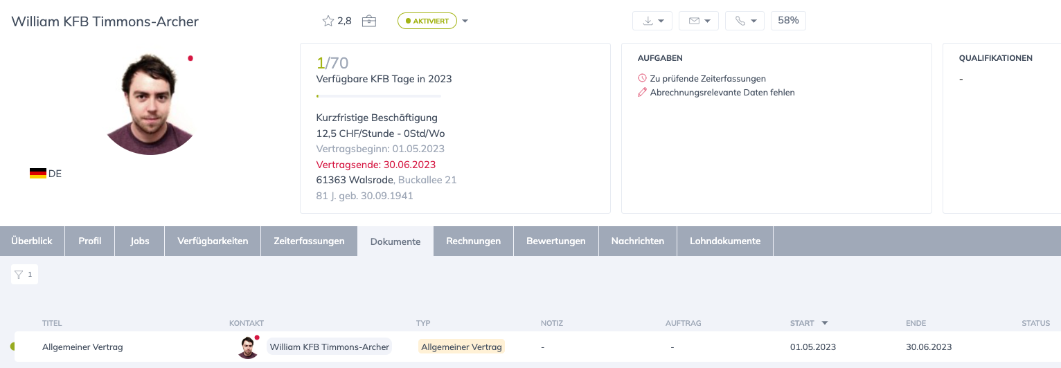 Wird dem Kontakt ein Dokument mit dem Typ Allgemeiner Vertrag hinzufügt, bestätigt und als unterzeichnet markiert, wird Start- und Enddatum des Dokumentes automatisch zum Vertragsbeginn sowie Vertragsende des jeweiligen Kontaktes.