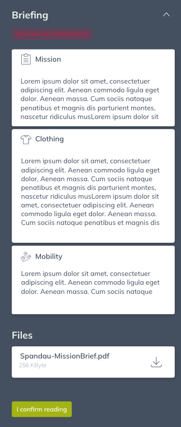 Durch einen Klick auf den Button Ich bestätige das Briefing gelesen zu haben kannst du deinem Arbeitgeber bzw. Projektleiter signalisieren, dass du alle notwendigen Informationen zur Durchführung des Einsatzes gelesen und verstanden hast.