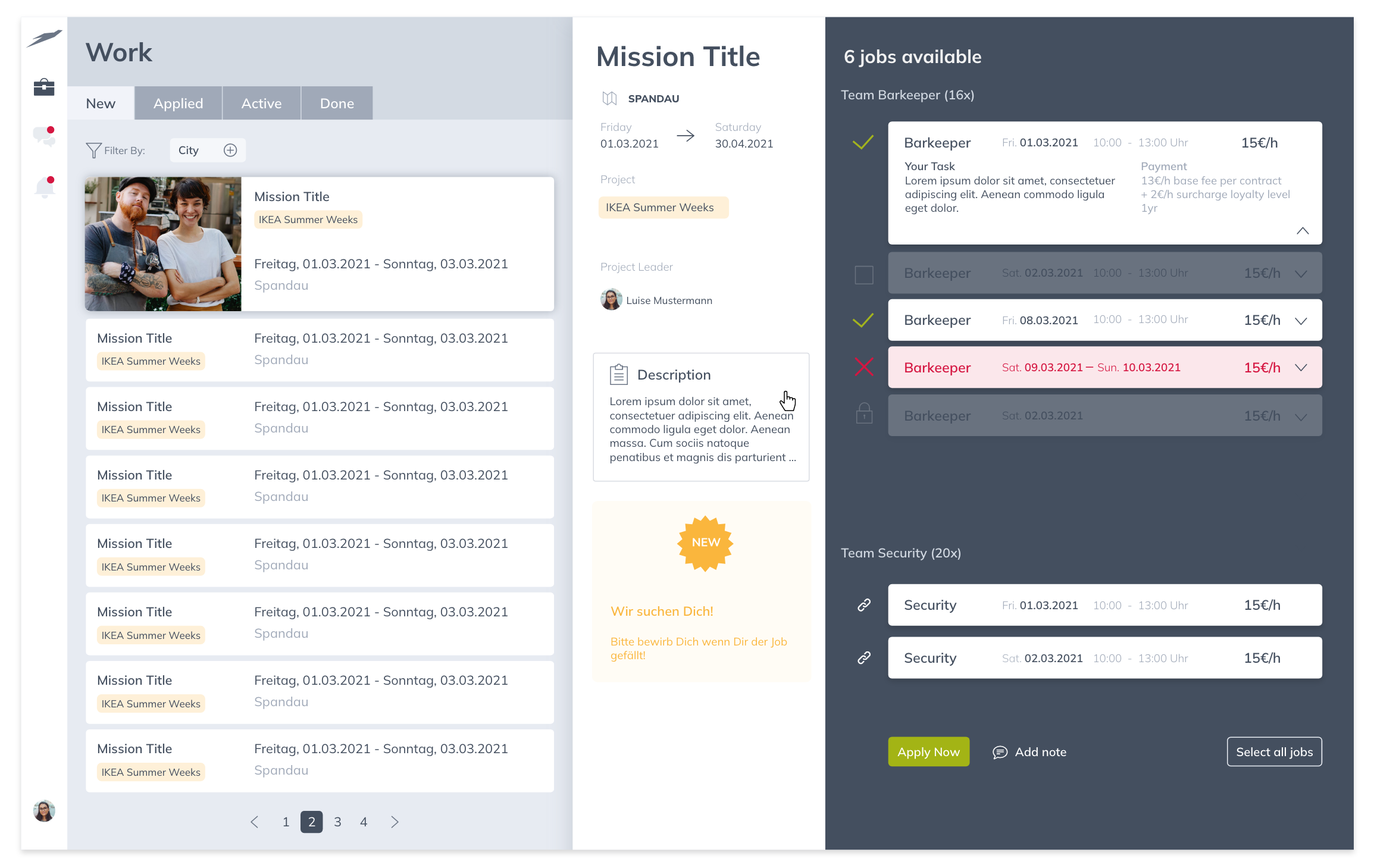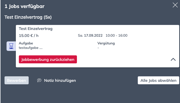 Im Tab Neu kannst du dich auf konkrete Jobs bzw. Einsätze innerhalb eines Auftrags bewerben. Standardmäßig sind alle Jobs für dich positiv ausgewählt. Durch Klick auf den Job kannst du den Job als negativ selektieren. Durch nochmaliges Klicken kannst du deine Auswahl neutralisieren und musst damit noch keine Entscheidung in Bezug auf deine Jobbewerbung tätigen.