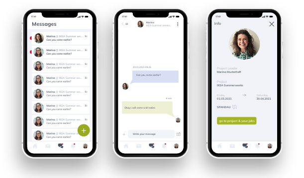 Du kannst Nachrichten an deinen Arbeit- bzw. Auftraggeber senden. Dein Arbeit- bzw. Auftraggeber bzw. Projektleiter kann dir auch Nachrichten als E-Mail, SMS oder InApp-Nachrichten senden.