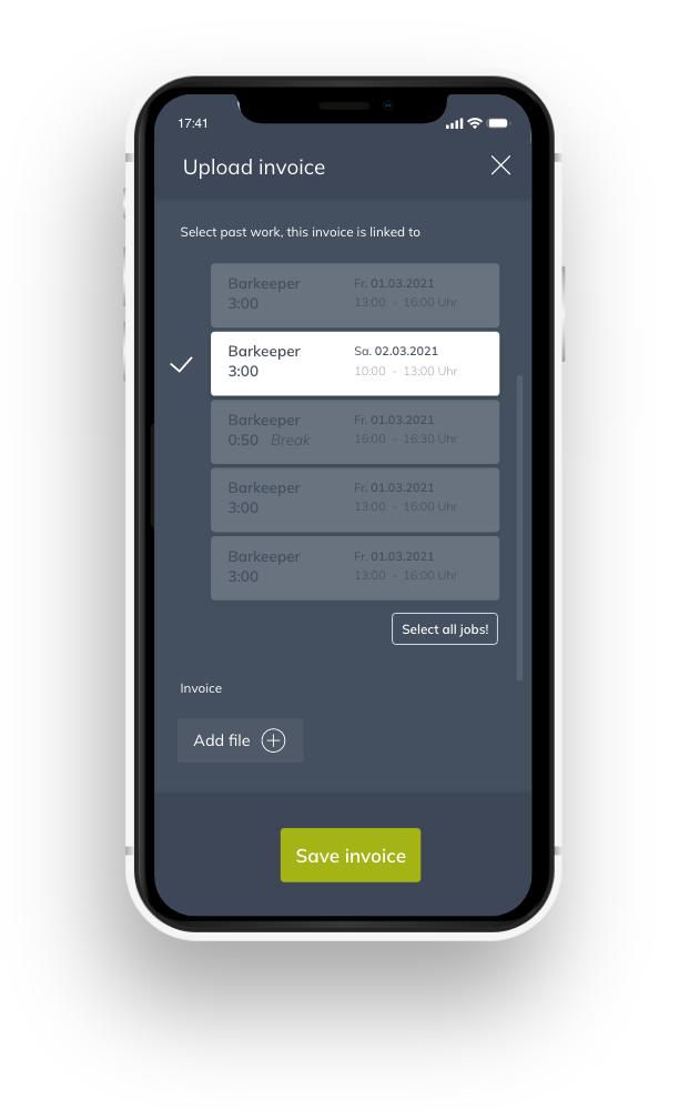 -Icon eine neue Rechnung hochladen. Du musst dabei die entsprechenden Zeiterfassungen auswählen, die in der Rechnung referenziert werden. Dein Auftraggeber kann diese Rechnung dann prüfen, bestätigen und weiter verarbeiten.